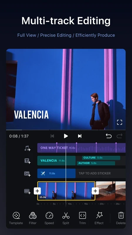 Antarmuka yang intuitif memudahkan kontrol atas segmen video dan memungkinkan Anda memperbesar/memperkecil linimasa dengan menggunakan berbagai alat, seperti menghapus, menyeret, menggambar, mengulang, dan membagi. Anda dapat melakukan opsi pembesaran dengan menggeser layar perangkat Anda menggunakan dua jari.